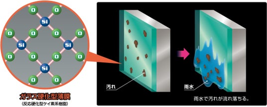 「自動車用反応型ガラス系コーティング技術」によって鉛筆硬度8H相当の高硬度なガラス系の被膜を形成し、紫外線や酸性雨などから強カにガードし、長期にわたって車体を保護します。