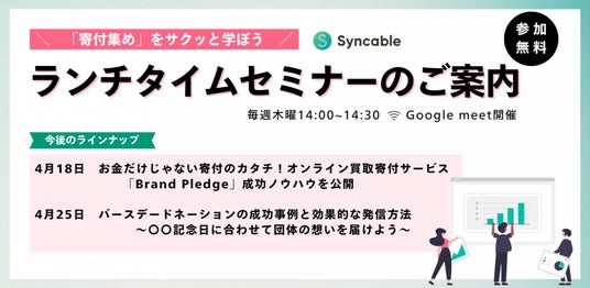 Syncableランチタイムセミナーでは、毎週木曜14:00 ~14:30にSyncableの活用方法や最新情報、成功団体のノウハウなどをお届けしていきます。移動中やお食事中でもお気軽にお聞きください。