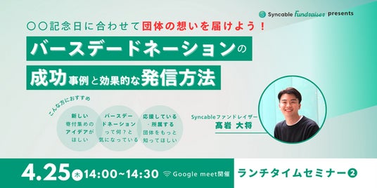 また、2024年4月25日(木) に開催する「バースデードネーションの成功事例と効果的な発信方法~〇〇記念日に合わせて団体の想いを届けよう~」を実施します。