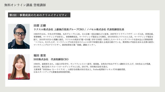 ビジネスシーンの先端で活躍し続けている経営者やクリエイターにご登壇いただき、本講座を受講することで得られる考え方や手法などを対談形式で解説します。ぜひお気軽にご参加ください。
