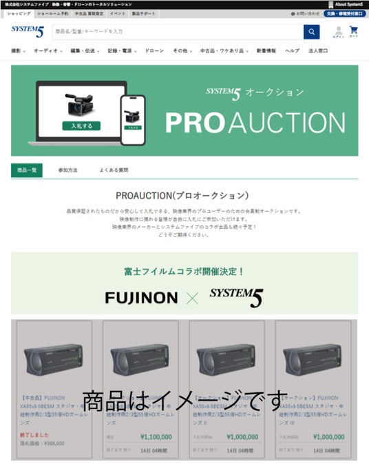 PROAUCTIONは、一般的なオークションサイトやフリマサイトには出回らない映像制作のプロ向け機材をオークション形式で出品し、入札による適正価格で必要とする方々へ提供するサービスです。オークション入札には個人・法人どなたでもご参加いただけますが、システムファイブ オンラインショップ( https://www.system5.jp/ )の会員登録(無料)が必要です。