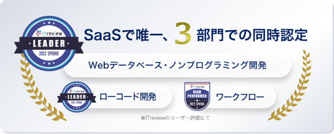 SmartDB(R)は、業務デジタル化にあたって重要な要素である「ワークフロー」、「Webデータベース・ノンプログラミング開発」、「ローコード開発」の3部門のうち、SaaSで唯一、「ワークフロー」でハイパフォーマー、そして「Webデータベース・ノンプログラミング開発」、「ローコード開発」でリーダーに認定されました。 なお、SmartDB(R)の3部門同時受賞は6期連続となります。