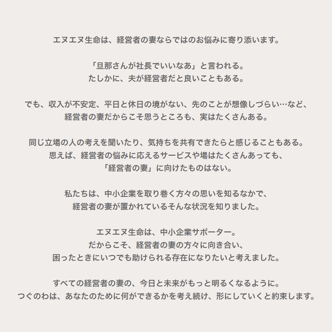エヌエヌ生命は、中小企業サポーターとして「保険金に留まらないサポート」の提供に注力しています。その活動のなかで、夫の急な逝去に伴って、妻が夫の事業を突然承継することになり、悩み苦しんでいる状況を知りました。そこで、現経営者の突然の経営離脱・相続発生時における事前準備を促すことで中小企業の円滑な事業承継を支援すべく、「つぐのわ」(https://www.nnlife.co.jp/wife-succession)を運営しています。