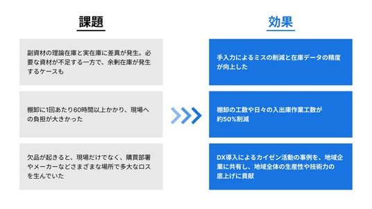伸和コントロールズ 九州事業所では、製造に必要な副資材を人手で管理していましたが、入力ミスや記録漏れにより、理論上の在庫と実際の在庫がしばしば食い違う課題を抱えていました。さらに、週15時間以上を要する入出庫作業や、1回60時間を超える棚卸業務が現場の大きな負担となり、業務効率の低下を招いていました。SmartMat Cloudを導入することでこうした課題を解決し、在庫管理の精度向上と業務負担の軽減が期待され導入に至りました。