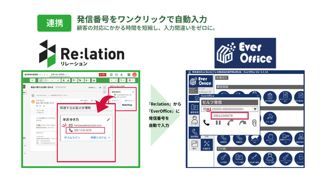 2. 『Re:lation』上の画面からワンクリックで『EverOffice』に発信番号を入力することができます