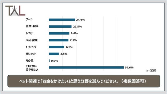 また、ペットの飼い主550名に「ペット関連で『お金をかけたい』と思う分野を選んでください」と質問したところ、「フード(24.4%)」と「医療・健康(23.5%)」が上位を占めました。情報への関心だけでなく、実際の支出意欲においても、ペットの健康や医療分野が重視されていることがうかがえる結果となりました。