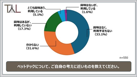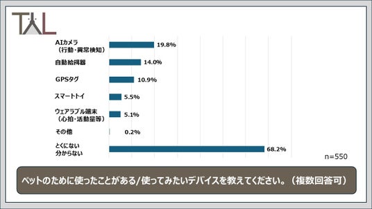 ペットの健康管理やコミュニケーションを支援する「ペットテック(IoT・AI・アプリなどの先端技術を活用した製品・サービス)」について、飼い主550名に意識調査をおこなったところ、33.1%が「興味はなく、利用予定もない」と回答しました。さらに「分からない」と答えた人を含めると、約65%の飼い主が現時点でペットテックを利用していない実態が明らかになりました。一方で、利用経験や関心のあるデバイスを尋ねたところ、「AIカメラ(19.8%)」「自動給餌器(14.0%)」「GPSタグ(10.9%)」など、飼育の負担を軽減する製品への期待は一定数集まっています。2026年に向けては、機能や価値の認知・理解をいかに広げていくかが、ペットテック普及の大きな課題となりそうです。