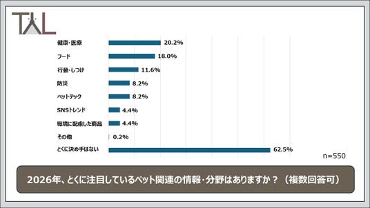 飼い主550名に「2026年、とくに注目しているペット関連の情報/分野はありますか?」と尋ねたところ、最も多かったのは「健康・医療(20.2%)」でした。次いで「フード(18.0%)」が続き、ペットの健康や日々の食生活に対する関心の高さがうかがえる結果となりました。