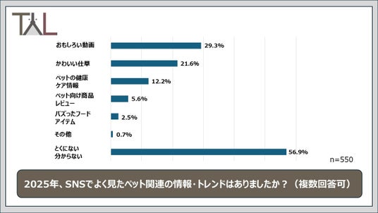飼い主550名に「2025年、SNSでよく見たペット関連の情報・トレンドはありましたか?」と尋ねたところ、最多は「おもしろい動画(29.3%)」、次いで「かわいい仕草(21.6%)」という結果となりました。一方、「SNSで見た情報をきっかけに購入したものはありますか?」という質問に対しては、84.9%が「ない」と回答しています。この結果から、SNSは商品購入の起点というよりも、日常の余暇時間に「おもしろい」「かわいい」といった癒しや娯楽を楽しむためのツールとして活用されている傾向が強いことがうかがえます。