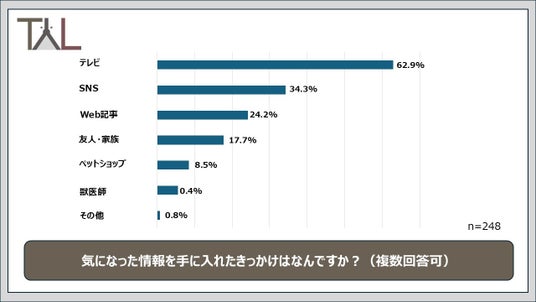 また、飼い主550名にペットとの生活を通じて生じた行動変化を質問したところ、「ペット関連の情報収集が増えた」と回答した人が14.8%と最も多い結果となりました。さらに、「気になったニュースがある」と答えた飼い主248名に情報を手に入れたきっかけを聞いたところ、最多は「テレビ(62.9%)」で、「SNS(34.3%)」、「Web記事(24.2%)」が続きました。インターネットでの情報収集が一般化する一方で、依然としてテレビが主要な情報源として強い影響力を持っていることがうかがえます。