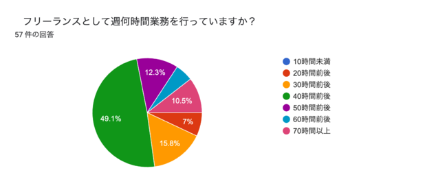「フリーランスとして週何時間業務を行っていますか?」との設問に対し、最も多かったのが「40時間前後」の49.1%で、全体のほぼ半数を占めました。正社員の稼働が1日8時間、週40時間と仮定すると同程度と考えられます。