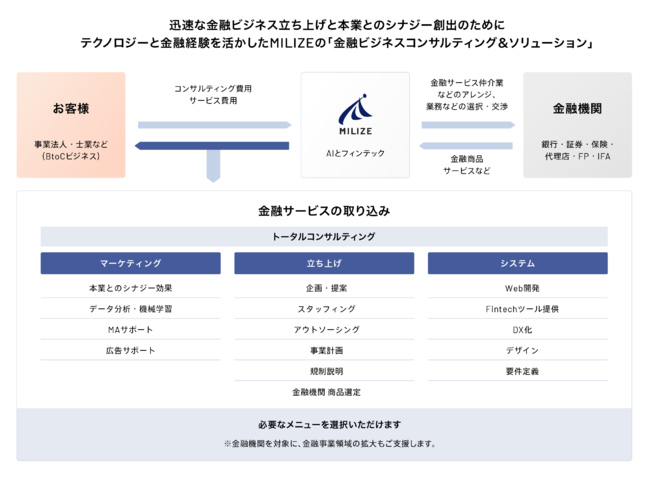 株式会社MILIZE(本社:東京都港区、代表取締役社長:田中徹、以下「MILIZE」)は、金融業の事業領域拡大、非金融業の金融事業参入のパートナーとして、計画策定と実行を支援する「金融事業参入コンサルティング&ソリューション」の提供を開始します。企画段階のコンサルティングからwebサイト構築、アプリ提供、金融商品選択、規制対応までをサポートします。