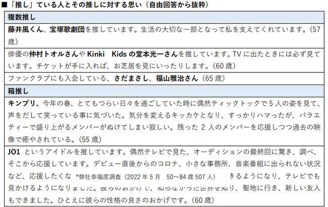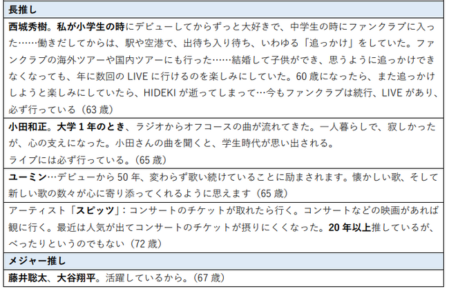 50歳以上女性の「推し」がいる割合は昨年から13%増え、約半数となりました。「推し」への関心や思いも強まっています。「お金がかかる」と悩みが増えたものの、推しに費やす金額も年間で約10万円。行動やコミュニケーション、パターンなどが多様になり、活動に幅が出てきました。昨年からの変化では、「複数推し」「箱推し」「長推し」「メジャー推し」の傾向がみられます。代表的なコメントを紹介します。