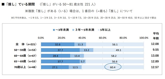 ・推している期間については、「5年以上」の長推し56.1%(124人)に対し、「5年未満」が43.9%(97人)。特に70歳以上が長推し傾向で、「5年以上」が60.4%(29人)。