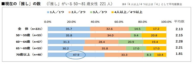 ・現在「推し」がいる221人に推しの数をたずねたところ、平均2.13人/個であった。70歳以上は単数推しが多く、平均は1.81。