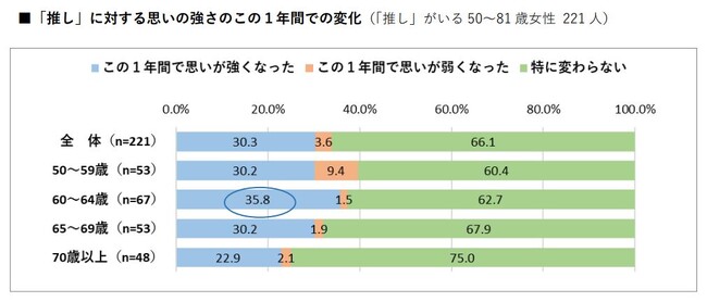 ⇒推しに対する思いの強さは、この1年間で「特に変わらない」が66.1%だが、「強くなった」人も30.3%。