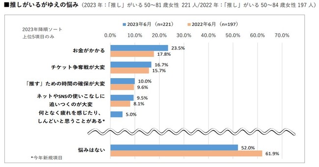 ⇒推しがいるゆえのお悩みトップは昨年同様「お金がかかる」で23.5%(52人)。昨年17.8%より5.7%増えた。2位「チケット争奪戦が大変」、3位「時間の確保が大変」は昨年とほぼ変わらず。悩みなしも52.0%(115人)と半数を超えるが、昨年の61.9%(122人)より約10%減っている。