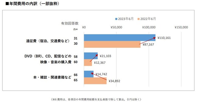 ⇒費用内訳で昨年より増加したのは、「遠征費(宿泊、交通費など)」や「DVD(BR)、CD、配信などの映像・音楽の購入費)」。逆に、「本・雑誌・関連書籍など」はダウン。