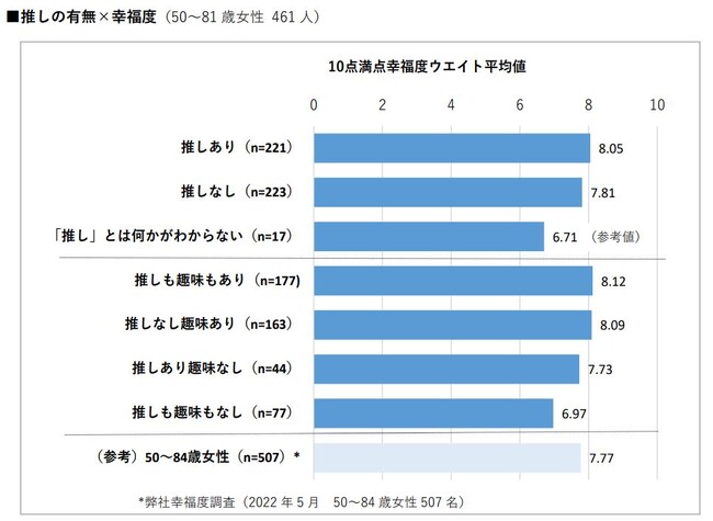 ⇒10点満点で幸福度を聞いたところ、推しあり(221人)のウエイト平均値は8.05と、推しなし(223人)の7.81を上回った。なお、推しがある人のうち80.1%(177人)は、推しのほかにも熱中している趣味や活動があり、その人たちの幸福度はさらに高い8.12であった。