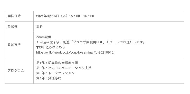 ウィルグループの総合人材サービスを手掛ける株式会社ウィルオブ・ワーク(本社:東京都新宿区、代表取締役社長 告野 崇)は、当社親会社の株式会社ウィルグループ(本社:東京都中野区、代表取締役社長 大原 茂)と、人と組織のミスマッチを可視化するサービス「ミツカリ」を提供する株式会社ミツカリ(本社:東京都渋谷区、代表取締役CEO 表孝 憲)の表 氏をお招きし、無料オンラインセミナー『社員のエンゲージメントを高めるコツ』を、2021年9月16日(木)に開催します。