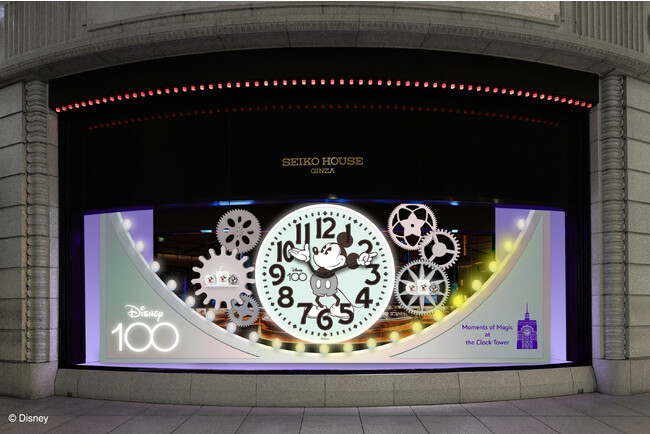 セイコーグループ株式会社(代表取締役会長 兼 グループCEO 兼 グループCCO 服部真二、本社:東京都中央区、以下「セイコー」)は、ディズニー創立100周年の一環として10月5日(木)から11月18日(土)まで、期間限定で銀座四丁目SEIKO HOUSE GINZA 時計塔の文字盤をミッキーマウスのデザインに模様替えします。これに合わせて、SEIKO HOUSE GINZAの中央ショーウインドウに、ミッキーマウスがテーマの大きな時計をディスプレイします。また、期間中SEIKO HOUSE GINZAの時計塔を本イベント「Moments of Magic at the Clock Tower」のテーマカラーであるパープルの光でライトアップします。