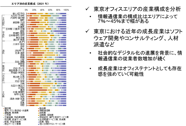専門サービス業が丸の内・大手町エリアに、インターネット付随サービス業や不動産賃貸業・管理業が渋谷エリアに集積している点が特徴的