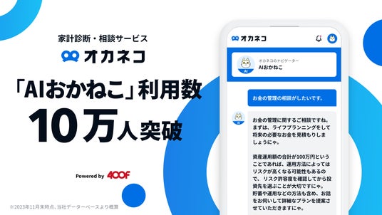 株式会社400F(フォーハンドレッド・エフ、本社:東京都中央区、代表取締役社長:中村 仁)は、家計診断・相談サービス『オカネコ』の機能である「AIおかねこ」の利用数が10万人を突破したことをお知らせします。