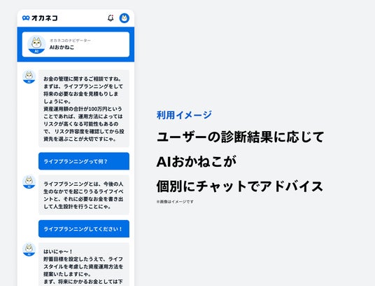 「AIおかねこ」は、ChatGPTの文章生成機能を活用し、診断いただいたユーザーに自動でアドバイスコメントを送ったり、ユーザーの質問に返答する機能です。本機能にはOpenAI社の「GPT-3.5」モデルを採用し、オカネコ公式キャラクター“おかねこ”が語尾に「にゃ」をつけた猫口調で返答します。