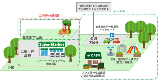 公園と商業施設を一体的に整備する手法として、パークPFIと立体都市公園制度を組み合わせた事例は全国的にもほとんど例がありません。立体都市公園制度を活用することで、公園の下部空間に都市公園法の制限が及ばなくなり、土地の有効活用が可能になります。