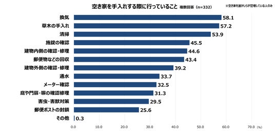 どのような手入れを行っているかを尋ねたところ、最も多かったのは「換気(58.1%)」と「草木の手入れ(57.2%)」で、続いて「清掃(53.9%)」、「施錠の確認(45.5%)」、「建物内側の確認や修理(44.6%)」が挙げられました。全体として“草木・清掃・空気の入れ替え”といった日常的な目に見えるメンテナンスが中心となっていることが分かります。