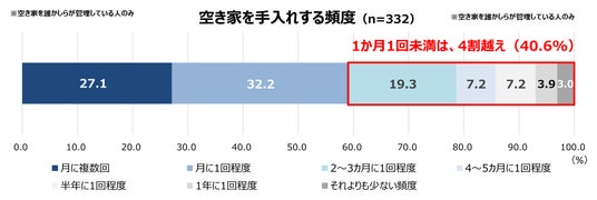 空き家を所有者本人や親族など誰かしらが管理している332名を対象に、どの程度の頻度で手入れをしているかを尋ねたところ、「月に複数回(27.1%)」「月に1回程度(32.2%)」と、全体の約6割(59.3%)が“月に1回以上”の手入れを実施していることが分かりました。