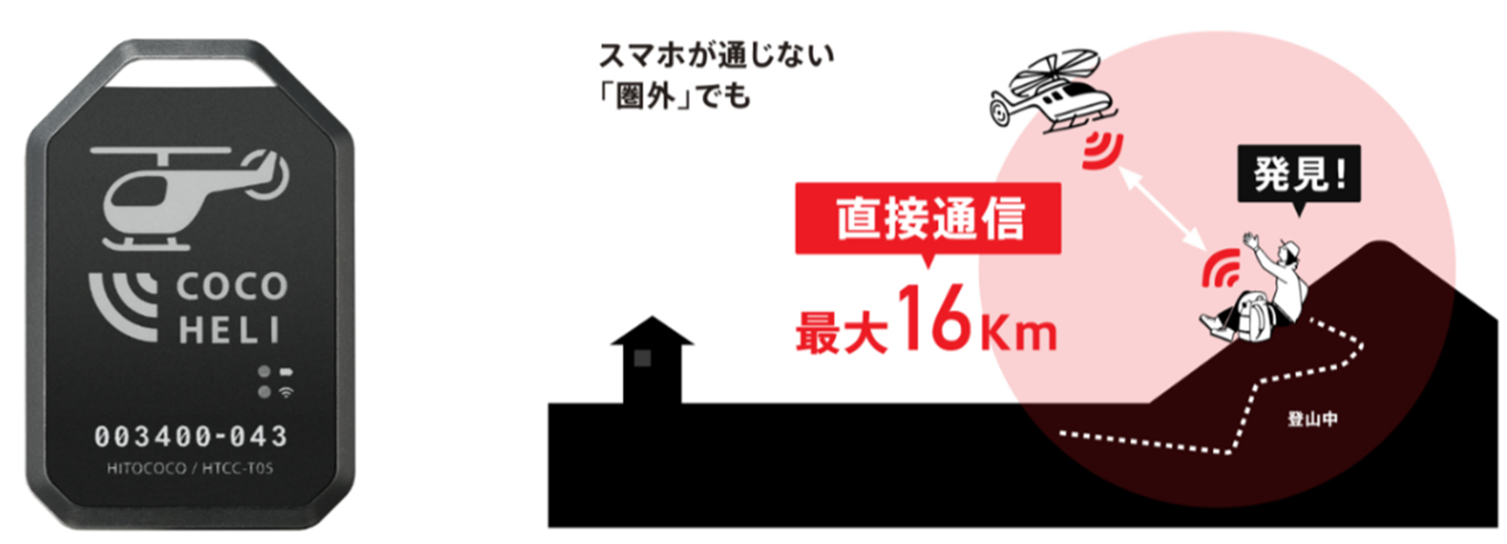 山域においては、スマホの「通信圏外」や登山者のケガ・死亡により「通信不能」となるケースが発生しています。ココヘリでは、会員に貸与される専用の発信機を活用し、様々な状況においても自分の位置を正確に捜索・救助機関に伝えることができます。また、全国の捜索ネットワークを駆使し、警察・消防と連携しながら、提携している民間ヘリコプター・ドローン、または地上からの捜索を実施しています。