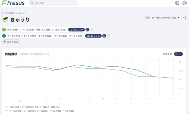こうしたデータと技術を基に開発した『Fresus』は、これまで難しいとされてきた青果物のサプライチェーンに関するデータを統合し、天候などの外部データも活用して将来の価格をAIで予測するサービスです。また、現在はバイヤー自身が市場に連絡を取ったり、各市場のWebサイトなどで確認している青果物の価格をダッシュボード上で確認・比較することも可能です。価格を調べたい/予測したい青果物を選択し、日付や市場を選択するシンプルな操作で情報を表示でき、専門的な知識がない方でもデータに基づく仕入れを計画できます。