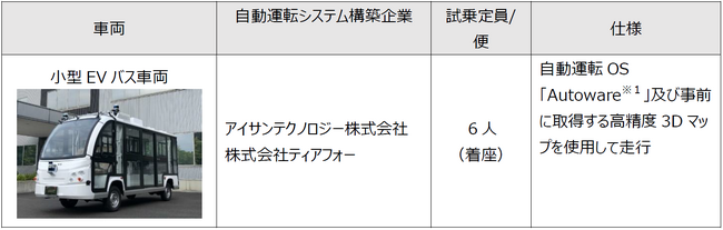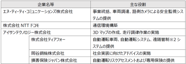 本年度は、実運行において交通事業者等により再現可能なビジネスモデルの完成度をさらに高めることを目指し、エヌ・ティ・ティ・コミュニケーションズ株式会社(本社:東京都千代田区、代表取締役社長:丸岡 亨)を幹事会社とし、株式会社ティアフォー(本社:愛知県名古屋市、代表取締役社長:加藤 真平)、岡谷鋼機株式会社(本社:愛知県名古屋市、取締役社長:岡谷 健広)、損害保険ジャパン株式会社(本社:東京都新宿区、代表取締役社長:白川 儀一)と共に、5社の共同体で愛知県より委託を受け事業実施をします。