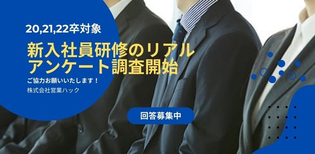 株式会社営業ハック(本社:東京都港区、代表取締役:笹田裕嗣)は、2022年5月13日よりアンケート調査を開始いたしました。多くのビジネスパーソンが入社と同時に受講する「新入社員研修」をテーマに行います。受講内容や受講後の心境をヒアリングし、新入社員が求めている新入社員研修とはどういったものなのかを調査いたします。対象は20,21,22卒のビジネスパーソンです。約1ヶ月回答を集計し、後日調査レポートとしてご報告させていただきます。