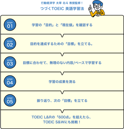 先ほど述べたように漠然とした遠い目標を設定すると、人は「現在バイアス」「自信過剰バイアス」によって自分を甘やかしてしまいがちです。英語の学習を継続して行うためには、漠然と“英語を話せるようになる!”という目標を立てるのではなく、具体的で細かい目標を立てることが重要です。その目標に一つ一つチャレンジしていくことが、「先送り」を防ぐことには効果があるでしょう。調査で“TOEIC Testsが英語学習の目標設定に効果的である”という結果も出たように、実現度の高い目標として、TOEIC Testsのような信頼性の高いテストを定期的に受験することで実力を測定していくことが望ましいと言えます。