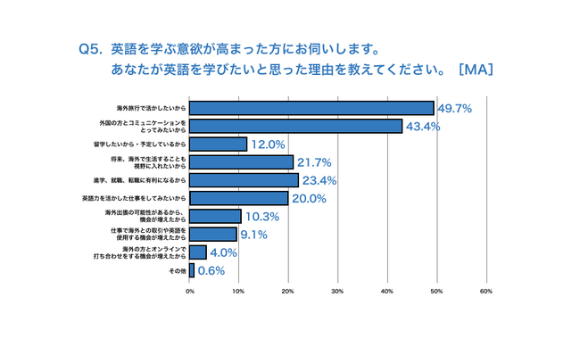 今回「コロナ禍のパンデミックが落ち着いてきている」と感じている男女500人に調査をしたところ、コロナ禍と比較して3人に1人が「英語を学ぶことに対する意欲が高まっている」という結果になりました。英語学習をしたい理由としては、「海外旅行に活かしたい(49.7%)」と、制限がなくなった今プライベートで英語を楽しみたいという結果が第1位に。