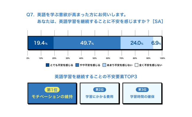 3. 英語学習に対する意欲が高まっている人が多い一方で、継続に不安を持つ人は7割。