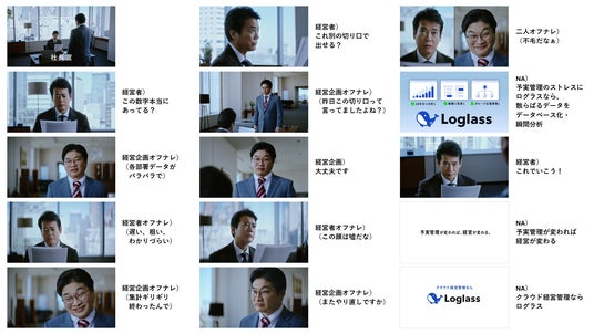 経営会議を翌週に控えた社長室にて、唐沢さんが演じる経営者に、松尾さんが演じる経営企画担当が“予実管理の分析レポート”を提出するシーンを描きます。レポート数値の正確性や分析切り口に納得がいかない様子の経営者。一方、経営企画担当は、各部署バラバラのデータを苦労して集計したにも関わらず、分析のやり直しを指示され、やるせない想いが込み上げます。思わず「不毛だなぁ」と心の中でつぶやく二人。そんな予実管理のストレスが「Loglass」によって解消され、確信に満ちた表情で経営判断を下す唐沢さんにご注目ください。