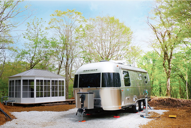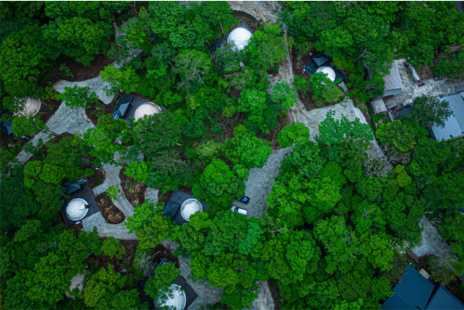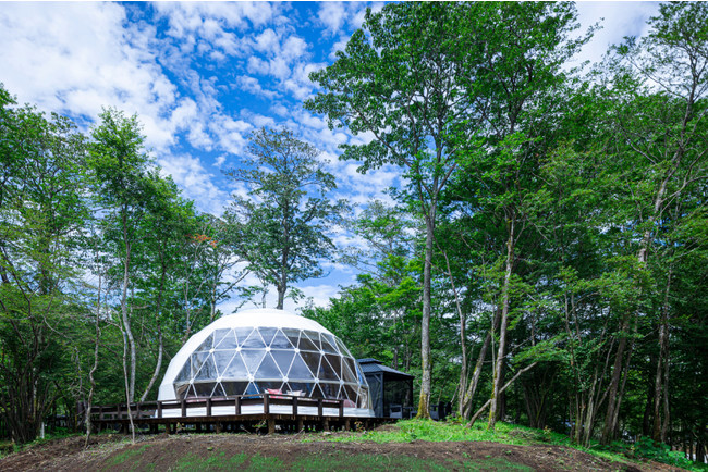 敷地面積約5万平米の広大な敷地内には、自然に溶け込むドーム型テントやトレーラーハウスを配置。