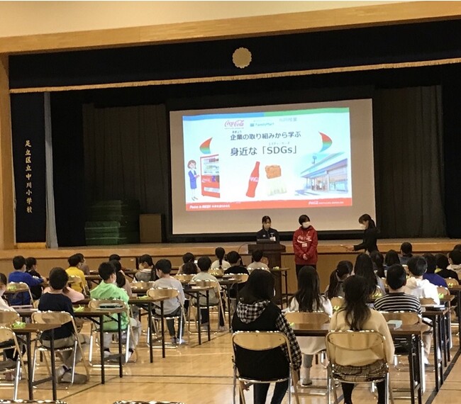 コカ・コーラ ボトラーズジャパン株式会社(本社:東京都港区、代表取締役社長 最高経営責任者:カリン・ドラガン、以下 コカ・コーラ ボトラーズジャパン)と株式会社ファミリーマート(本社:東京都港区、代表取締役社長:細見研介、以下 ファミリーマート)は、 SDGs(持続可能な開発目標)の分野における連携・協力事業を今後、推進してまいります。第一弾として小学生向け出前授業を2023年2月22日に実施しました。