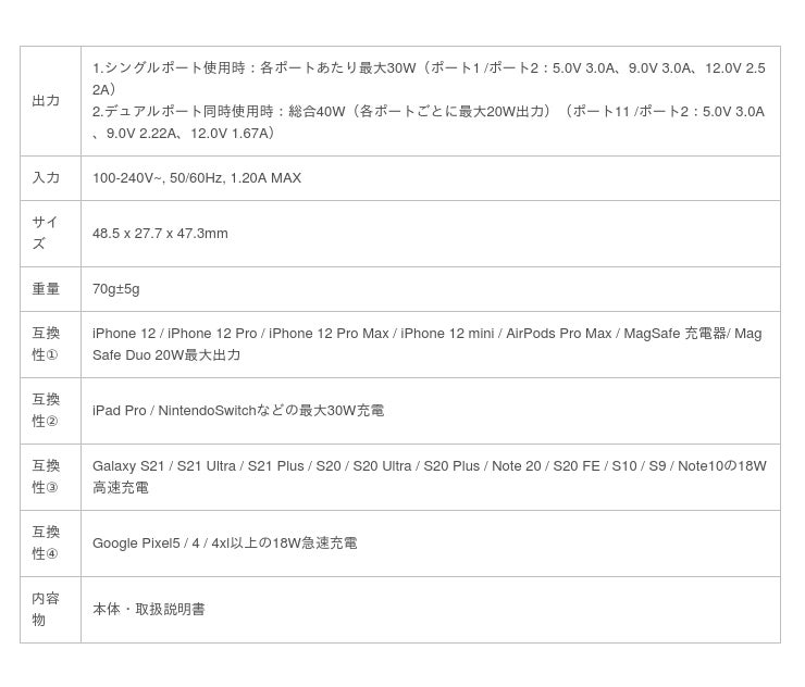 ・1つのポートを使用する場合は、最大30Wの出力:Macbook Air、iPad Pro、iPad Air、iPhone 12/12 Pro / 12 Pro Max / 12 Mini / iPhone 11 / iPhone SE 2020 / iPhone X / XS / XR / XS Max / 8 / 8Plus AirPods Pro Maxとの互換性になります。
