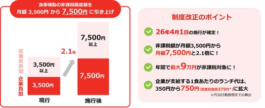 現在、長引く物価高騰や深刻な人手不足は、働く世代の家計と企業の人材獲得の双方に大きな影を落としています。こうした社会背景の中、2026年4月1日より、食事補助制度における非課税限度額が月額3,500円から7,500円へと約42年ぶりに倍増となる歴史的な税制改正が施行されました。