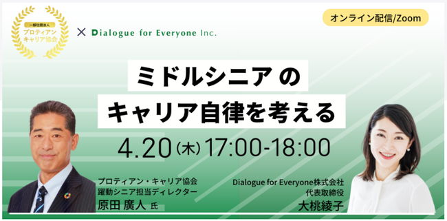 組織と個人のより良き関係性構築と個人の主体的なキャリア開発を支援する一般社団法人プロティアン・キャリア協会 (東京都新宿区、代表理事:田中研之輔・有山徹、以下、「当協会」)は、Dialogue for Everyone株式会社(本社:東京都目黒区 代表取締役:大桃綾子 以下、「DfE社」)と40代50代ミドルシニア層に特化したキャリア自律×越境学習プログラムを強化するため業務提携をすることをお伝えいたします。