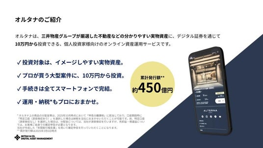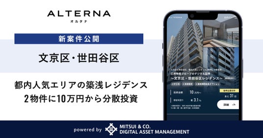 三井物産デジタル・アセットマネジメント株式会社(以下「当社」)は、当社が提供するオルタナティブ投資サービス「ALTERNA(オルタナ)」において、「三井物産グループのデジタル証券~文京区・世田谷区レジデンス~(譲渡制限付)(*1)」を公開し、募集を開始したことをお知らせいたします。