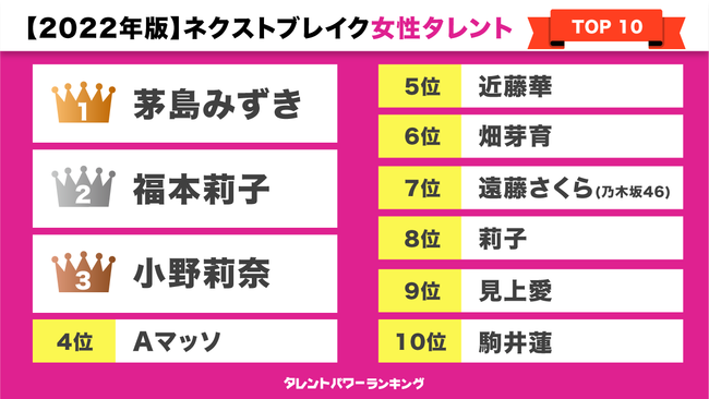 女性タレントは、ブレイクの登竜門とされる「ポカリスエットのCM」や「全国高校サッカー選手権の応援マネージャー」を務めた女優の茅島みずきが1位にランクイン。2022年には映画の出演も決定しています。
