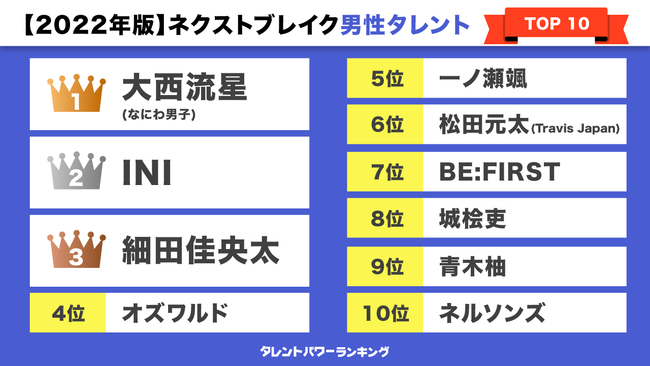 男性タレントは、昨年2021年にドラマで主演を務め話題となったジャニーズのなにわ男子で活躍する大西流星が見事1位にランクイン。すでに2022年1月オンエアのドラマに出演しており、今年も勢いが止まりません。