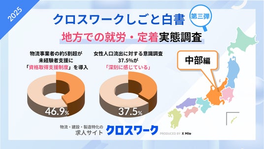 ノンデスク事業者向けの人材採用システム『クロスワーク』を提供するX Mile株式会社(読み:クロスマイル、本社:東京都新宿区、代表取締役:野呂 寛之、以下『当社』)は、物流業界の働き方に関する実態調査「クロスワークしごと白書2025」の第三弾として、『地方での就労・定着』に関する独自調査を実施しました。本調査の中から、「中部地方」の物流業界の現状に着目したところ、地元から離れて働く人材や未経験者向けの支援の実態、さらに女性の地元離れへの課題意識の現状が浮き彫りになりました。なお、当社では現地拠点にて、取材をお受けすることも可能です。ご希望の方はお気軽にご連絡ください。
