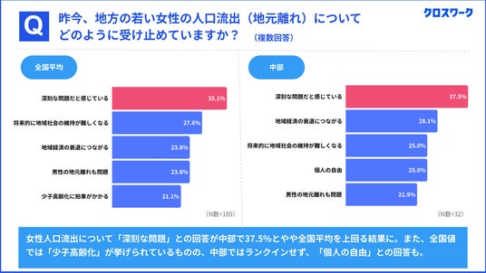 中部地方では、地方の女性人口流出に対して「深刻な問題だと感じている」と回答した企業が37.5%と、全国平均の35.1%をわずかに上回る結果となりました。