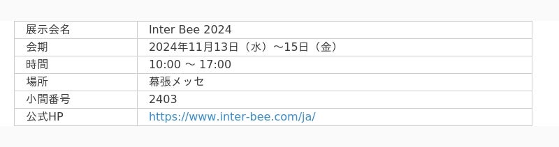 コーンズテクノロジー株式会社(本社:東京都港区、代表取締役社長 西岡和彦)は、2024年11月13日(水)~15日(金)に幕張メッセにて開催される、音と映像と通信のプロフェッショナル展『Inter BEE 2024』に出展いたします。